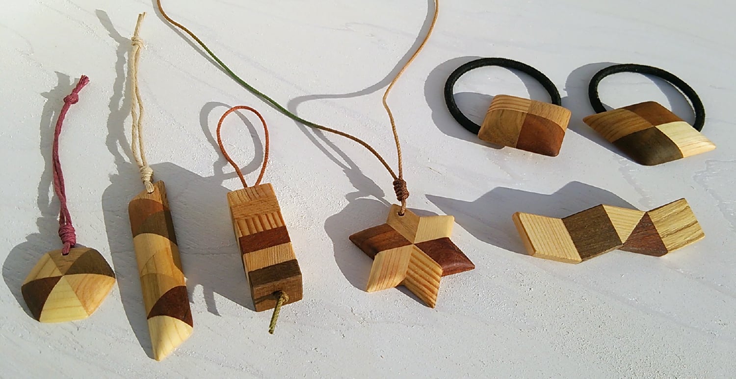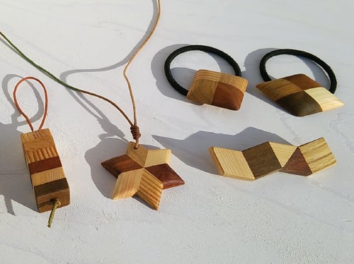 三角・四角・ひし形の木片を組み合わせて、ストラップ、ブローチ、ヘアゴム、ペンダントなどがお作りいただけます。初心者でも気軽に挑戦ができる体験です。